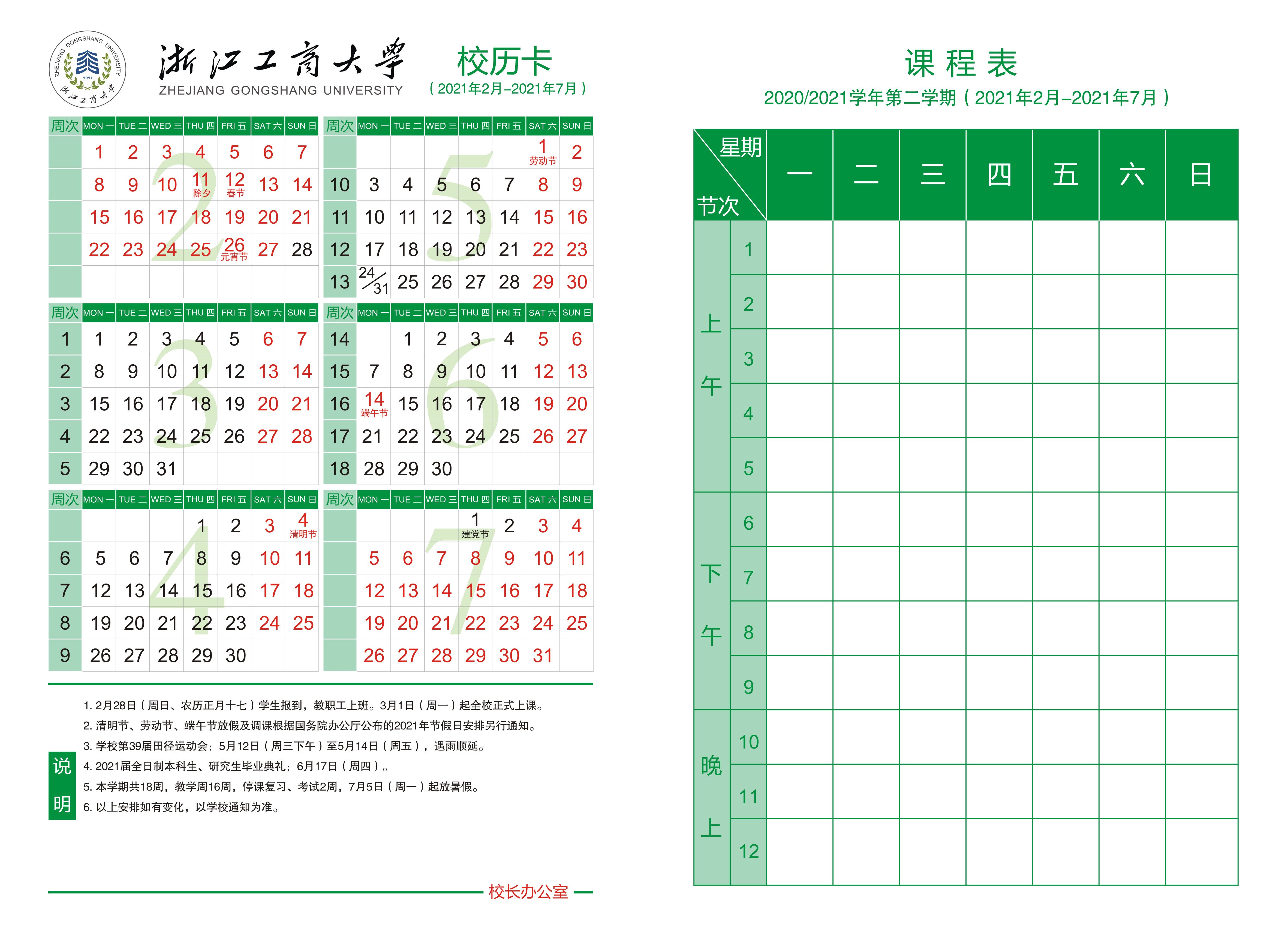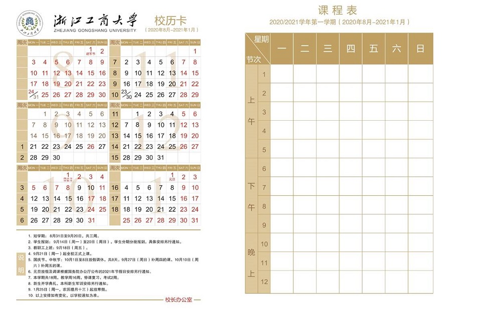 2020-2021学年第一学期校历卡