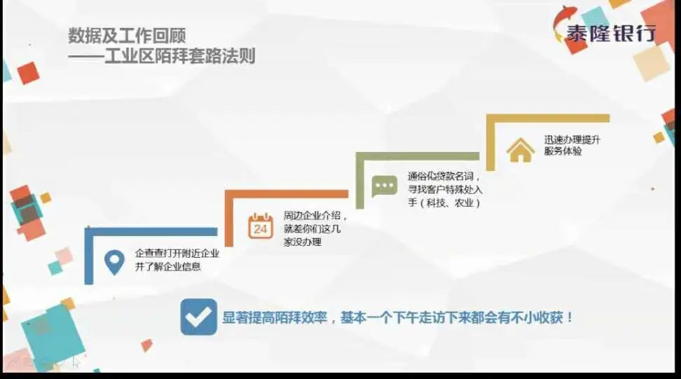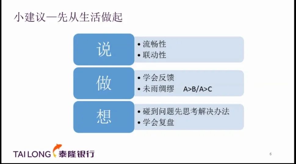 /span> /span> /span> /span>薛经理主要进行了工作案例分享。首先,他结合实例介绍了工业区陌拜套路法则和水杯法则;其次,他讲述了如何在“一项转换”、“一块基石”和“一个聚焦”的基础上用金融产品提升客户体验感;最后,他将泰隆银行与其他银行的优势与劣势进行分析比较,阐述如何做到“扬长避短、突出优势”。 /span>