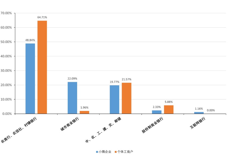 第一,现阶段中小银行为小微主体提供了更多的融资支持,为普惠金融发展发挥着重要作用。在基本账户设立方面,大型国有银行虽占比较高,但其在提供信贷方面仍有不足。这一现象表明中小银行是服务小微主体的主力军,应该为中小银行的发展留足空间,并提供可行的政策支持。