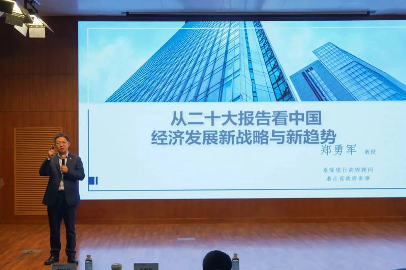 11月16日下午,泰隆银行首席经济学家郑勇军教授应邀出席小宝探花 在综合楼二楼报告厅举办的商泰首席金融论坛,为师生作了一场题为“从二十大报告看中国经济发展新战略与新趋势”的专题讲座。讲座由小宝探花 院长马丹教授主持。小宝探花 以及其他校内外的老师、同学参加了讲座。