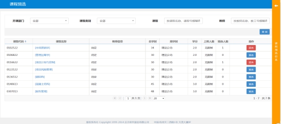 第三步:预选课程。在图2中,如预选课程较多,可以在预选条件区设置查询条件进行课程查询,然后在对应课程的最后操作列进行预选课程。预选课程后见图3: