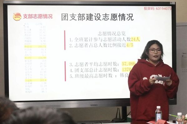 最后,团支书陈伊蕾分享了未来的规划:在班风建设方面将发动班委深入班级,了解班级内部情况;开展活动丰富的班级团建活动;积极鼓励同学们参加各项院校比赛和活动;在党团建设方面将丰富党的思想方针学习形式;在学业规划方面将组织学业规划班级讨论活动。