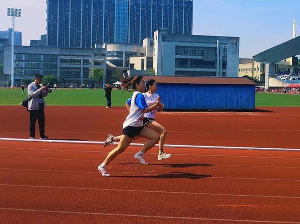 起跑极其关键,王梓欣同学努力冲刺,尽管另外几道的同学速度稍快。但是,她并没有放弃,而是坚定地大步继续向前。在终点线附近,王梓欣尽力追赶,最终以坚持不懈的姿态完成了比赛!
