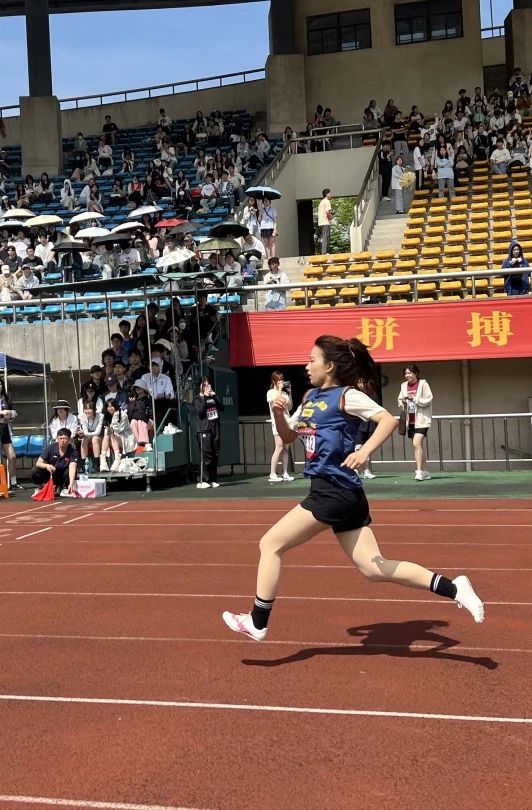 一声发令枪响起,胡珏飞驰而去,步伐轻盈而有力,仿佛踏着云彩。目光炯炯注视着前方,轻轻垫脚一跃而过,如流星划过天际。