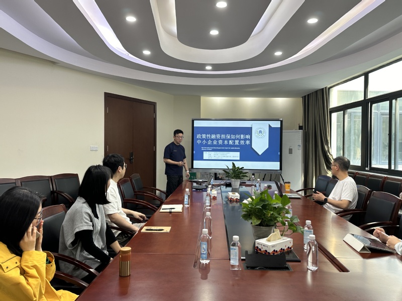 张铭心博士首先汇报了最新的工作论文, 文章通过在在实地调研的基础上,以政策性融资担保体系中起步较早、体系较完善和运行效率较高的浙江省担保集团数据为研究样本,考察政策性融资担保对企业资本要素扭曲和资源配置效率的影响。研究结果表明,政策性融资担保在改善中小企业的资本错配和资源配置效率方面发挥了积极作用,政府担保可以显著降低资本扭曲,其内在机制是通过显著增加企业投资,改变企业的要素投入占比和要素价格降低资本扭曲。进一步的分析还发现,担保可以通过降低扭曲进而改善企业的资源配置效率。稳健性分析、安慰剂检验和工具变量回归都证明了结论的稳健型。异质性分析中,本文发现反担保措施和再担保的加入并不利于改善资本扭曲,银行的异质性和银行分担比例的不同也没有显著影响基准回归结果。对企业的分样本回归发现,担保对非专精特新企业、非“山区26县”和在杭的企业起到更为显著的扭转资本扭曲的作用。
