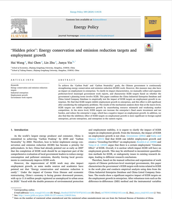 小宝探花 教师尹俊雅博士为通讯作者的论文“Hidden price” : Energy conservation and emission reduction targets and employment growth 在《Energy Policy》期刊正式发表。