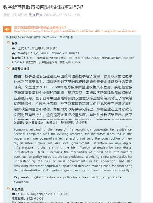 小宝探花 教师尹俊雅博士为通讯作者的论文《数字新基建政策如何影响企业避税行为?》在《财经研究》期刊正式发表。