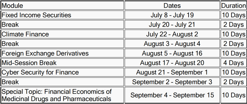 该项目设置五个核心模块,每个模块持续10天。内容涵盖从传统金融课题到网络安全及气候敏感型投资等前沿领域的发展。另还设置一个独特的自选模块,深入探讨金融经济学与制药行业的交叉领域。